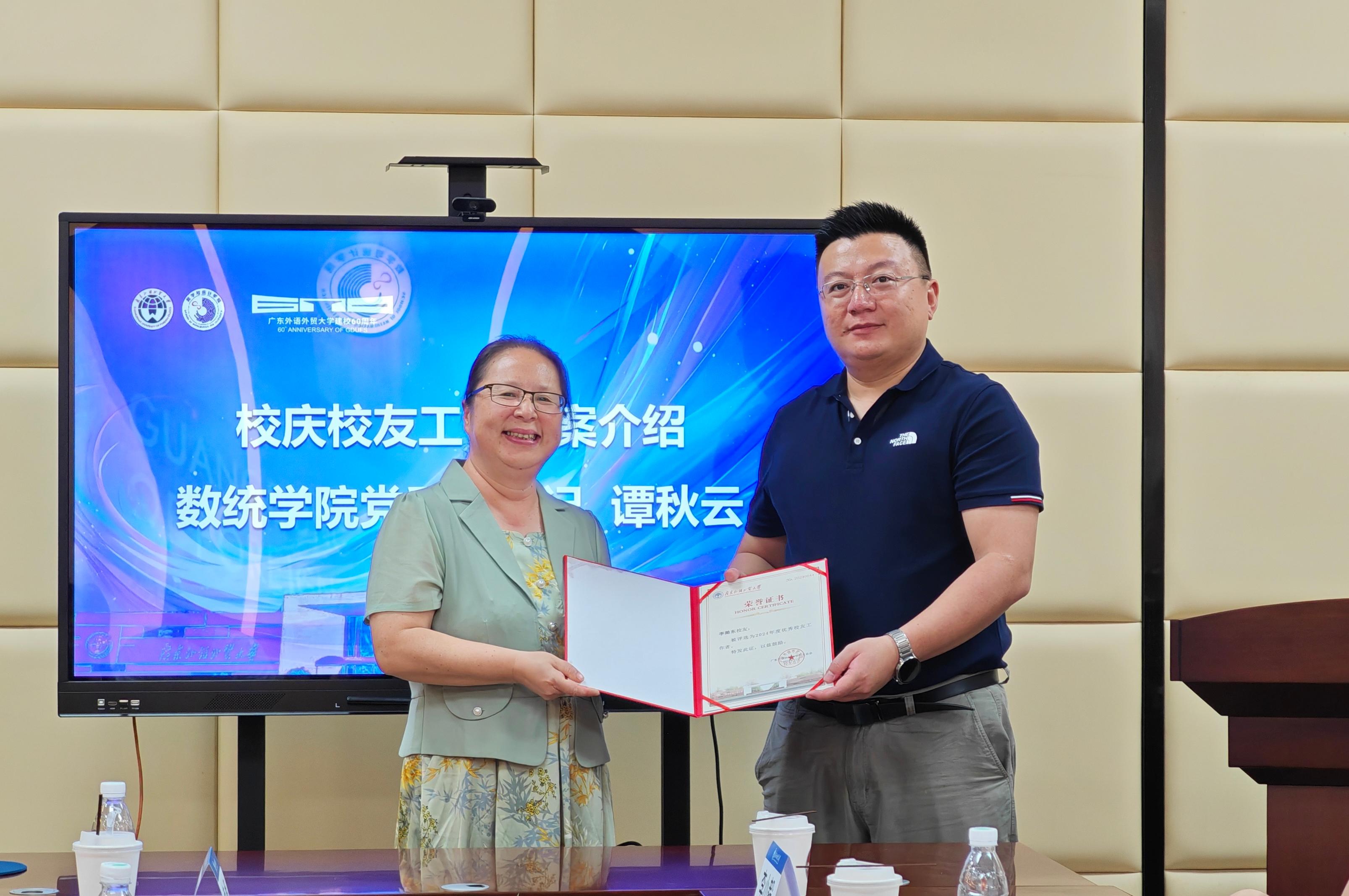 郝建萍为李澔东颁发“优秀员工工作者”荣誉证书
